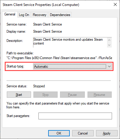 - Under the **General **tab, set **Startup type **to Automatic.