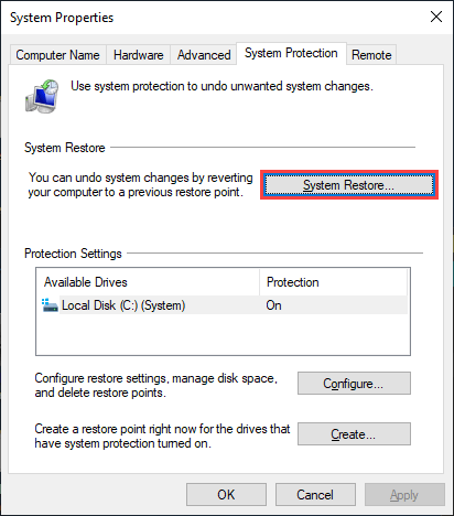 Switch to the System Protection tab and select System Restore.