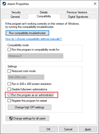 Under the **Settings **section, check the box next to Run this program as an administrator.