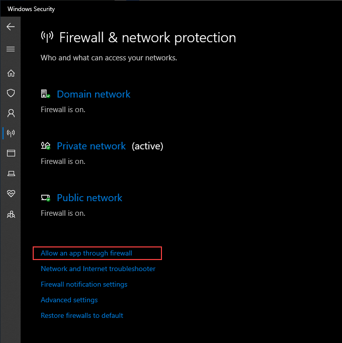 Go to **Firewall & network protection **> Allow an app through firewall.