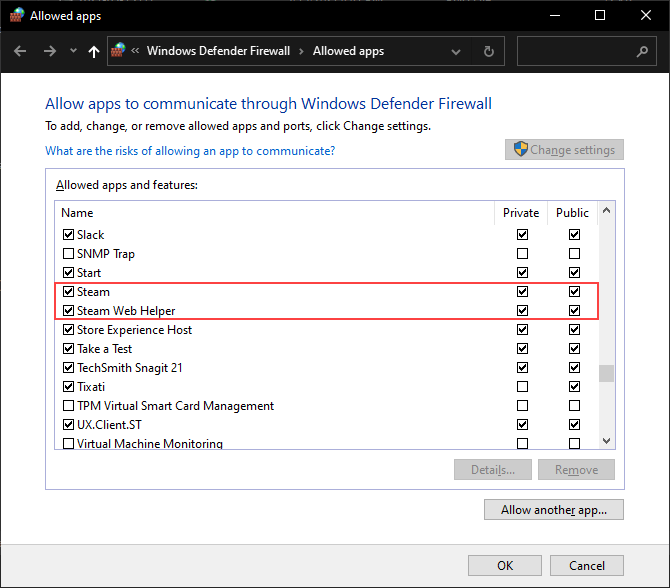 If you don’t see **Steam **or **Steam Web Helper **within the Windows Firewall, select Allow another app and add the following files within the directories below: * Steam: C:Program Files (x86)SteamSteam.exe