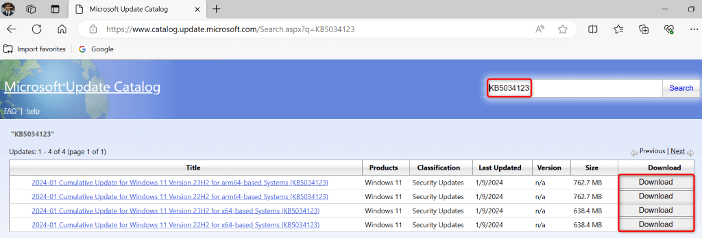 - Launch a web browser and open the Microsoft Update Catalog site.