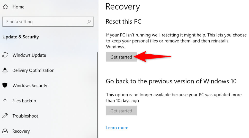 - Choose Get started in the Reset this PC section.