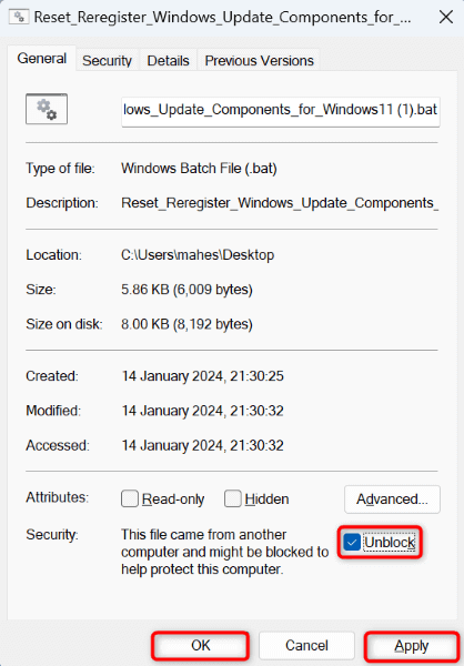 - Enable the Unblock option and choose Apply followed by OK.