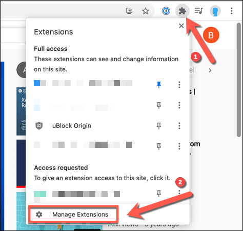 - To do this in Google Chrome, select the Extensions icon in the top-right. From the menu, select the **Manage Extensions **option.