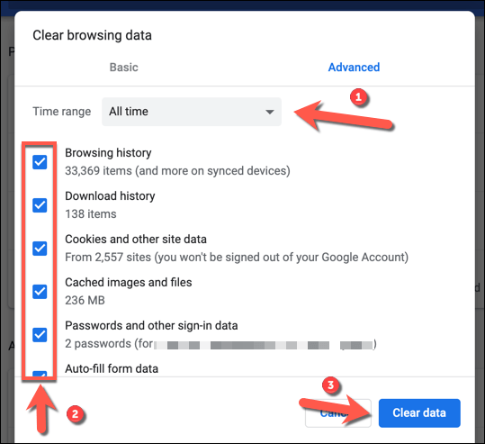 - Make sure that **All time** is selected in the **Advanced **menu and that all checkboxes below it are selected. When you’re ready to proceed, select **Clear data** to clear your cache files.