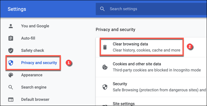 - In the **Settings** menu, select **Privacy and security **> **Clear browsing data**.