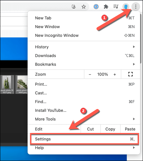- To do this in Google Chrome, select the three-dots menu icon > Settings.