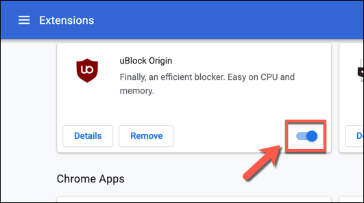 - In the **Extensions** menu, select the **slider icon** next to your ad blocking extension. When the slider is gray, the extension is disabled.