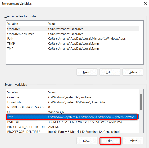 - Choose Environment Variables. * Select Path in System Variables and choose Edit.
