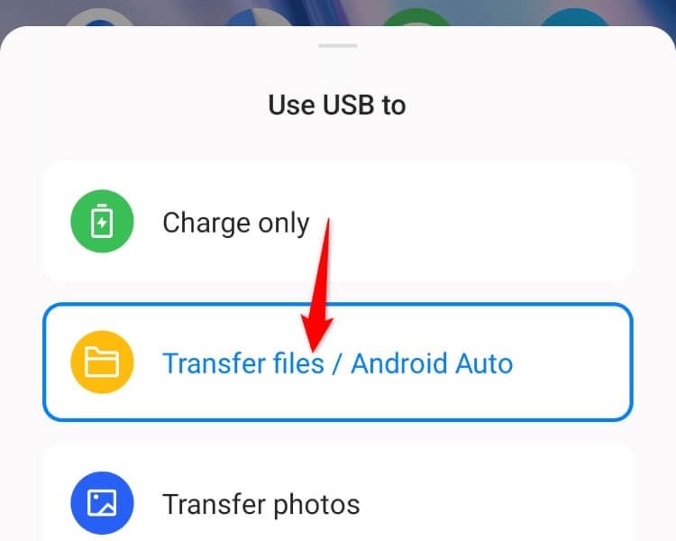 - Choose an ADB-supported connection type. The exact name for this option varies by device. On our phone, it says Transfer files/Android Auto.
