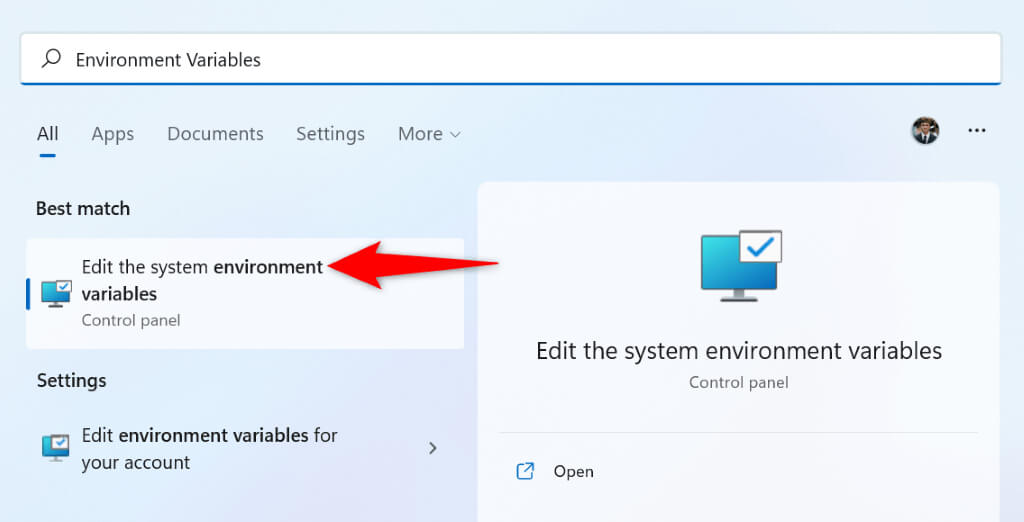 - * Open the Start menu, search for Environment Variables, and select the Edit the system environment variables option.