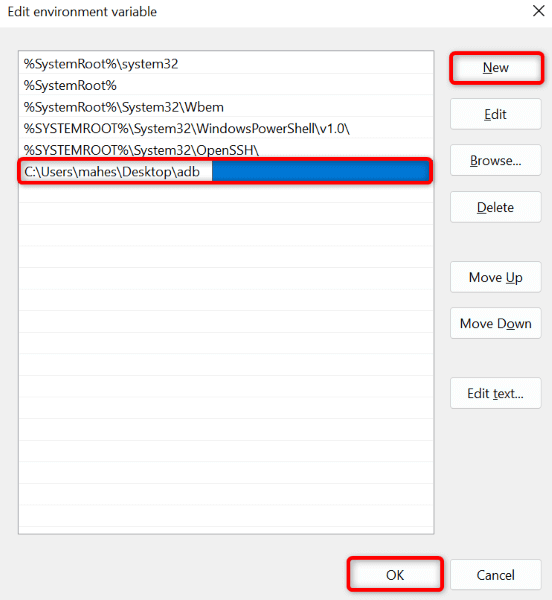 - Select New to create a new entry. * Enter the path to your ADB folder (where the adb.exe file is located) and press Enter.