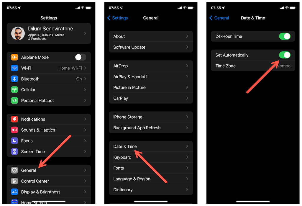Having a clock that’s not in sync with the time for your region often leads to connectivity issues with most mobile apps. So, review your phone’s date and time settings and make adjustments if needed. To get to them, open the Settings app and tap General > Date & Time (iOS) or System > Date & Time (Android).