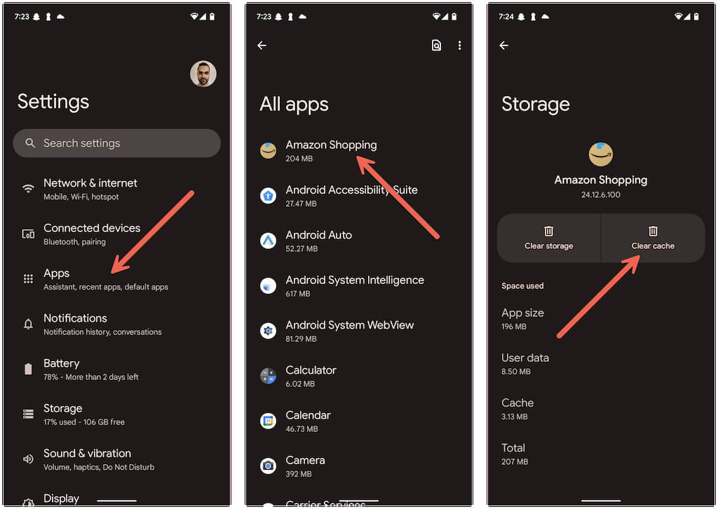 Open the Settings app on your Android phone and tap Apps > See all apps > Amazon. Then, tap Storage & cache > Clear cache.