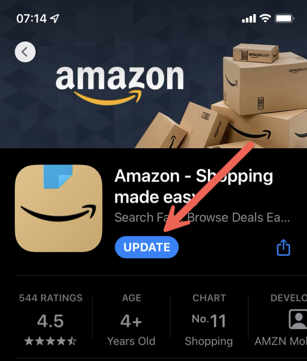 Outdated versions of Amazon’s apps can encounter issues while communicating with the Amazon servers. So, check for any pending updates and install them. Search for the app on Apple’s App Store or the Google Play Store and tap Update to update to its latest version.