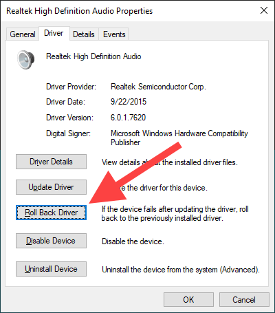 Note: You can’t use the Roll Back Driver option in the steps below if you haven’t updated your audio drivers.