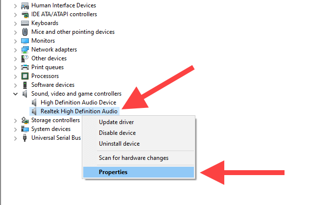 Right-click the audio card driver and select Properties.