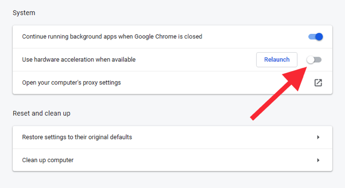 Turn off the switch next to Use hardware acceleration when available.
