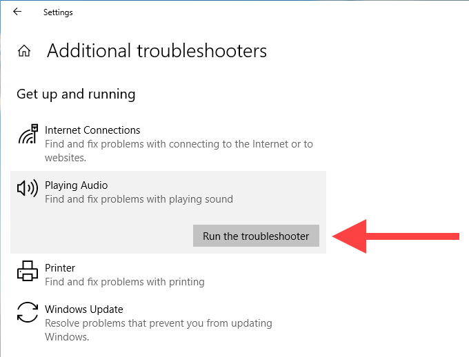 Select Playing Audio, and then select Run the troubleshooter.