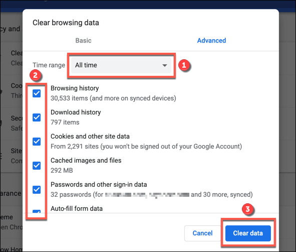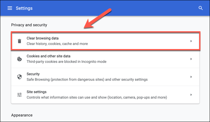 If reloading the web page hasn’t resolved an Err_Cache_Miss error, then the browser cache (including cookies and other data) could be corrupted, preventing the page from reloading correctly. If that’s the case, the only option is to clear your browser data, including cookies.