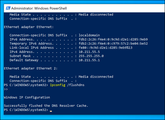 - In the **PowerShell **window, type the following commands to fully reset your network configuration and DNS cache: