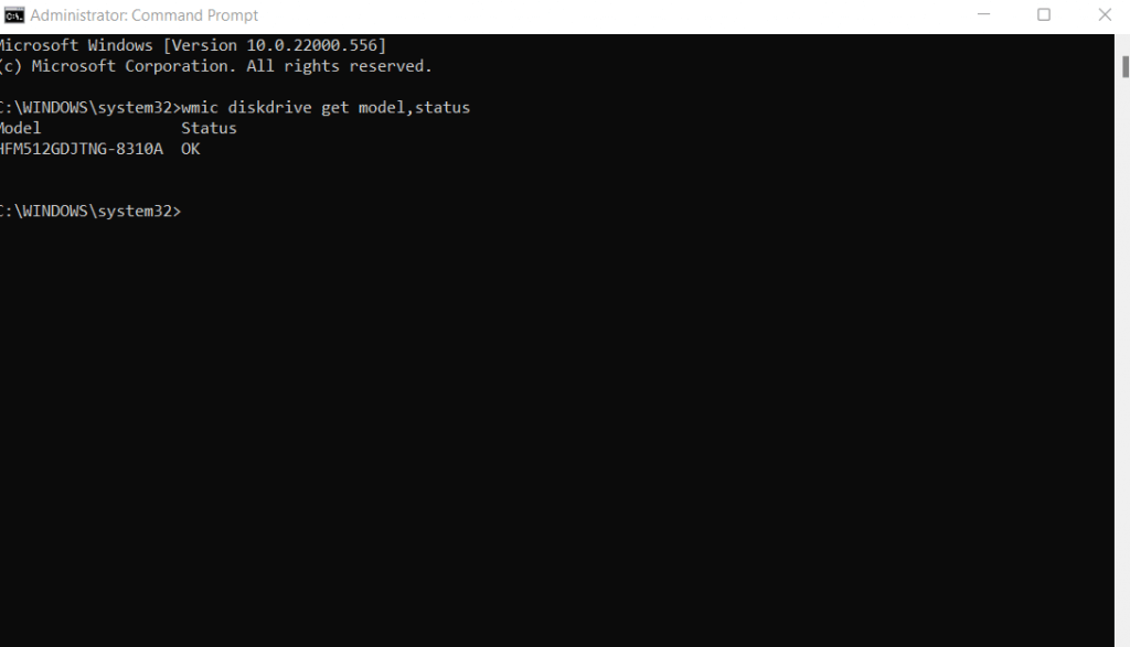 - Type the following command and press Enter: wmic diskdrive get model,status