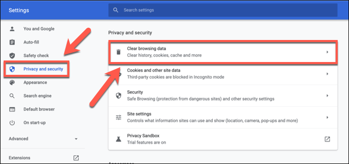 - In the **Settings** menu, select **Privacy and security **> **Clear browsing data**.