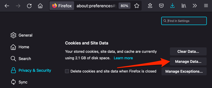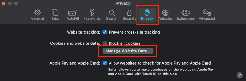 - Go to the “Privacy” tab, select **Manage Website Data**.