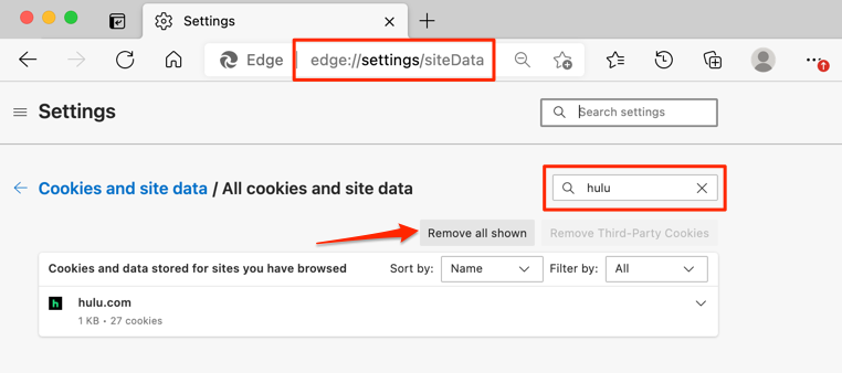 Close all Hulu tabs, paste edge://settings/siteData in the address bar, type hulu in the search bar, and select Remove all shown.
