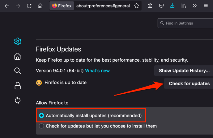 For Firefox, go to Settings and select Check for updates in the “Firefox Updates” section. We also recommend toggling on Automatically install updates so Firefox updates itself when there’s a new version.