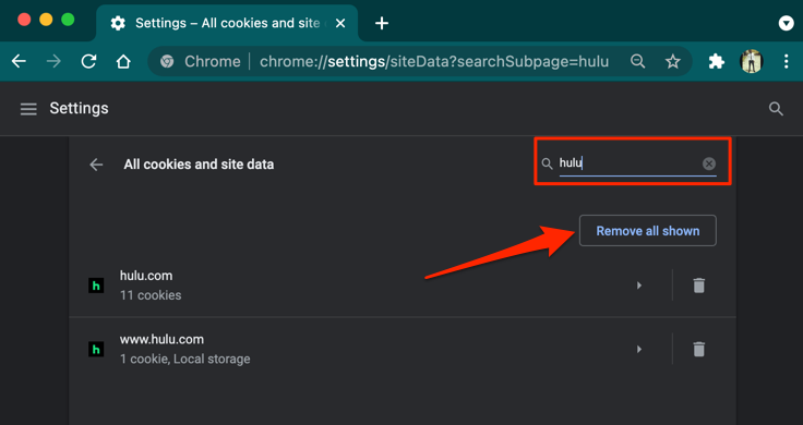 Paste chrome://settings/siteData in the address bar, press Enter, type hulu in the search bar and select Remove all shown.