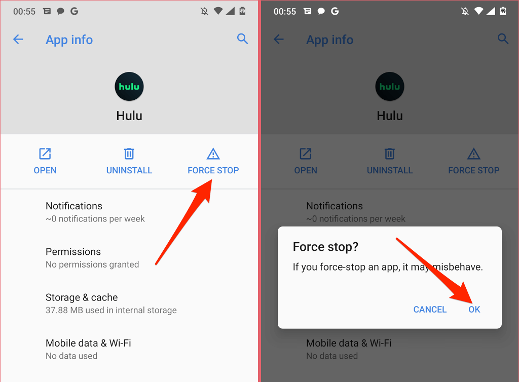 To force-close Hulu on Android, go to Settings > Apps & notifications > All Apps or See All Apps > Hulu > Force Stop and select OK on the prompt.