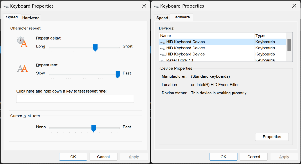 The Keyboard Properties window has options to adjust your keyboard’s repeat rate and delay. Experiment and play around with these settings until you find a sweet spot.