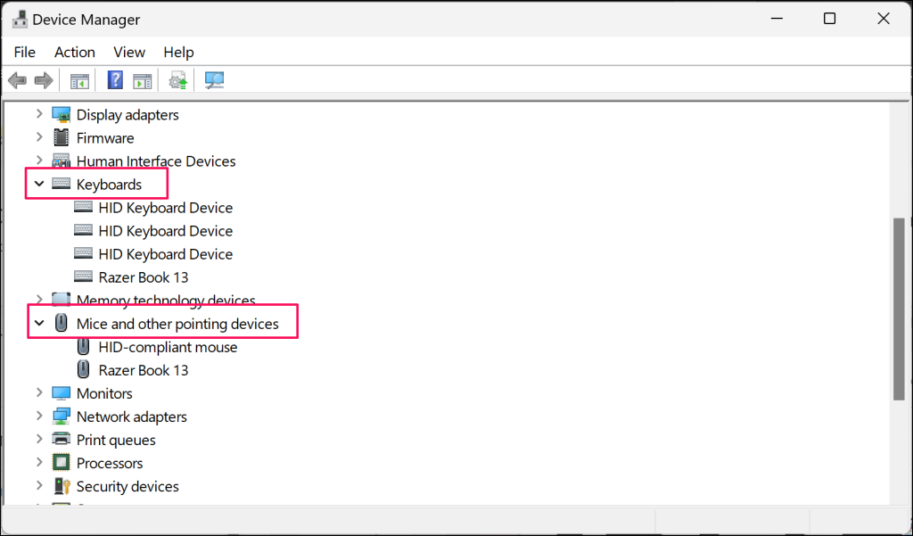 - Expand the **Keyboards** and **Mice and other pointing devices** categories.