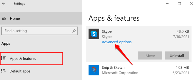 - Go to **Settings** > **Apps** > **Apps & features**, select the affected program, and select **Advanced options**.
