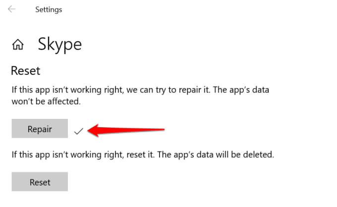 Wait until a check mark appears next to the Repair button. That indicates a successful repair operation.