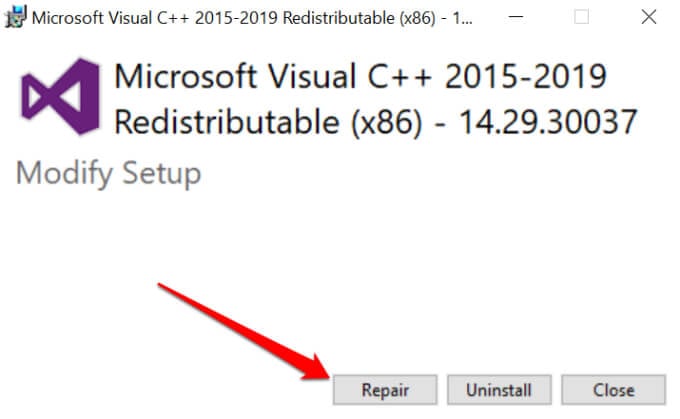 Note: You may find two versions of the Microsoft Visual C++ 2015-2019 Redistributable—the 32-bit (x84) and 64-bit (x64) versions. Repair both versions of the redistributable.