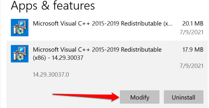 - Launch the Windows Settings app, go to Apps > Apps & features > **Microsoft Visual C++ 2015-2019 Redistributable **and select Modify.