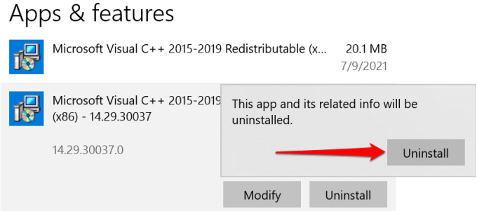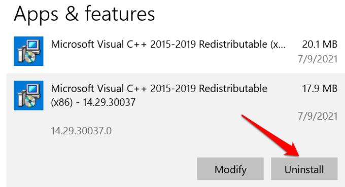 - Head to Settings > Apps > Apps & features > Microsoft Visual C++ 2015-2019 Redistributable and select Uninstall.