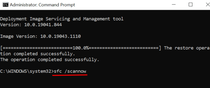 This command will replace corrupt or missing system files with the cached copies (downloaded by the DISM) from Microsoft’s servers.