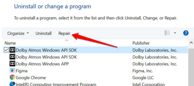 - Select the problematic app and select **Repair**.