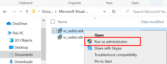 - Right-click the files (vc_redist.x64 or vc_redist.x86), click Run as administrator, and follow the prompt.