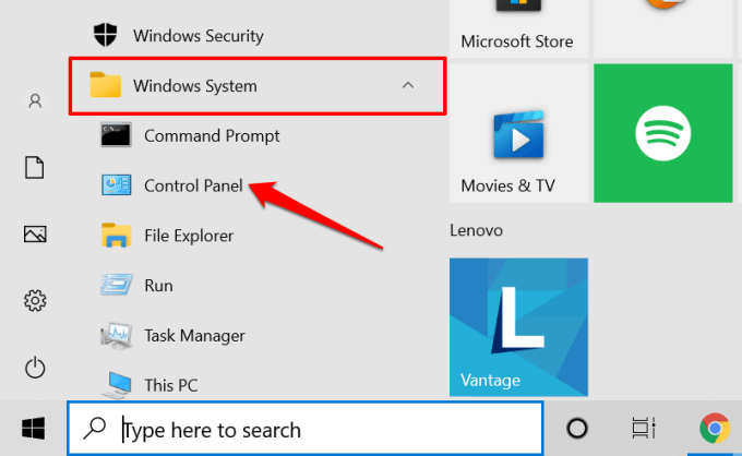 - Press the Windows key to launch the Start Menu. Expand the Windows System folder and select Control Panel.