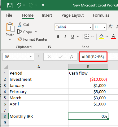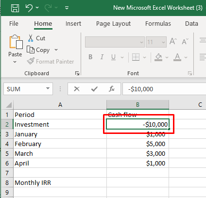 If you’re dealing with inconsistent signs, like in our example below, make sure to input all initial outgoing cash flows as negative numbers. The function assumes that there are both positive and negative cash flows.