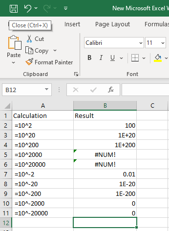 Note: in new Microsoft Excel versions only large numbers will result in the #NUM error. The numbers that are too small will result in 0 (general format), or 0.00E+00 (scientific format).