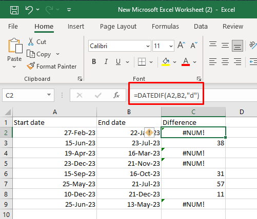 =DATEDIF(A2,B2,”d”) calculates the difference in the number of days between two dates (in cells A2 and B2). The result would be numerical if the date in cell A2 is less than the date in cell B2. If this is not the case, as in our example below, the result will be the #NUM error.