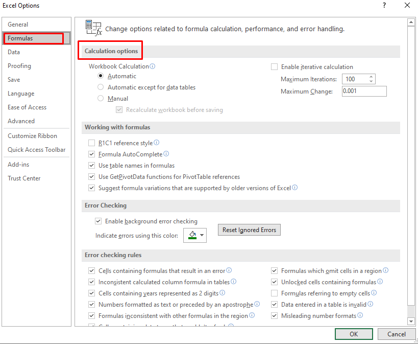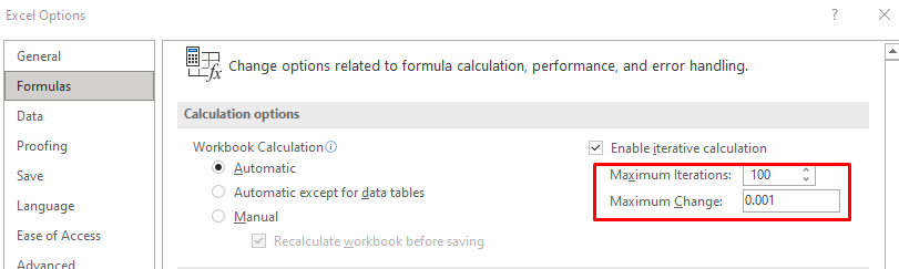 - In the Maximum iterations box enter the number of times you want your formula to recalculate. A higher number increases the likelihood of it finding the result. * In the Maximum Change box, specify the amount of change between calculation results. Smaller numbers provide more accurate results.