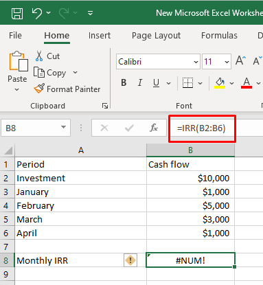 Like with other iteration functions, the IRR function can result in a #NUM error because the formula can’t find the result after a certain number of iterations. You can easily resolve this issue if you increase the number of iterations and provide the initial guess. Look at the previous section for examples.