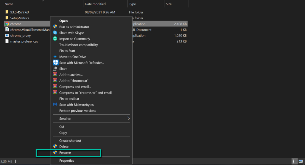 - Look for Chrome.exe. Right-click on it and select **Rename. **